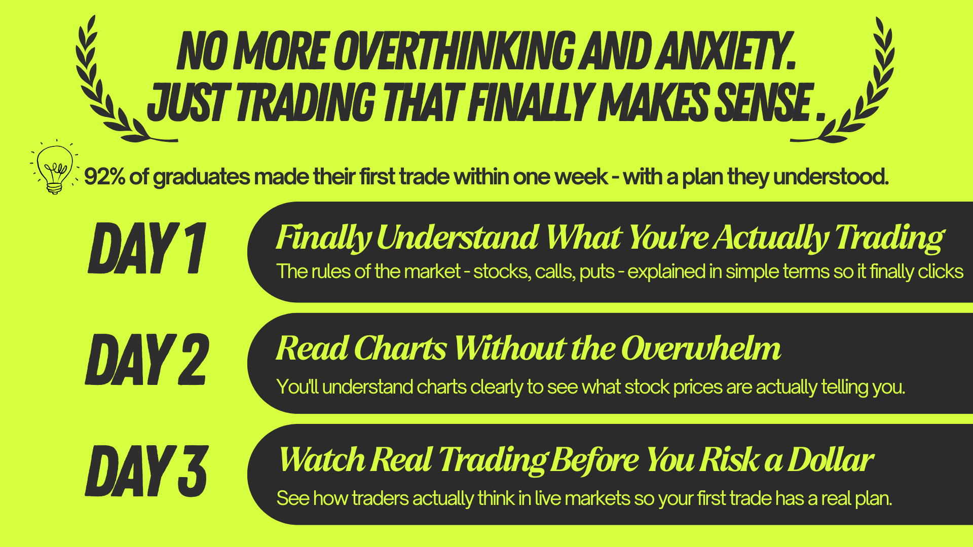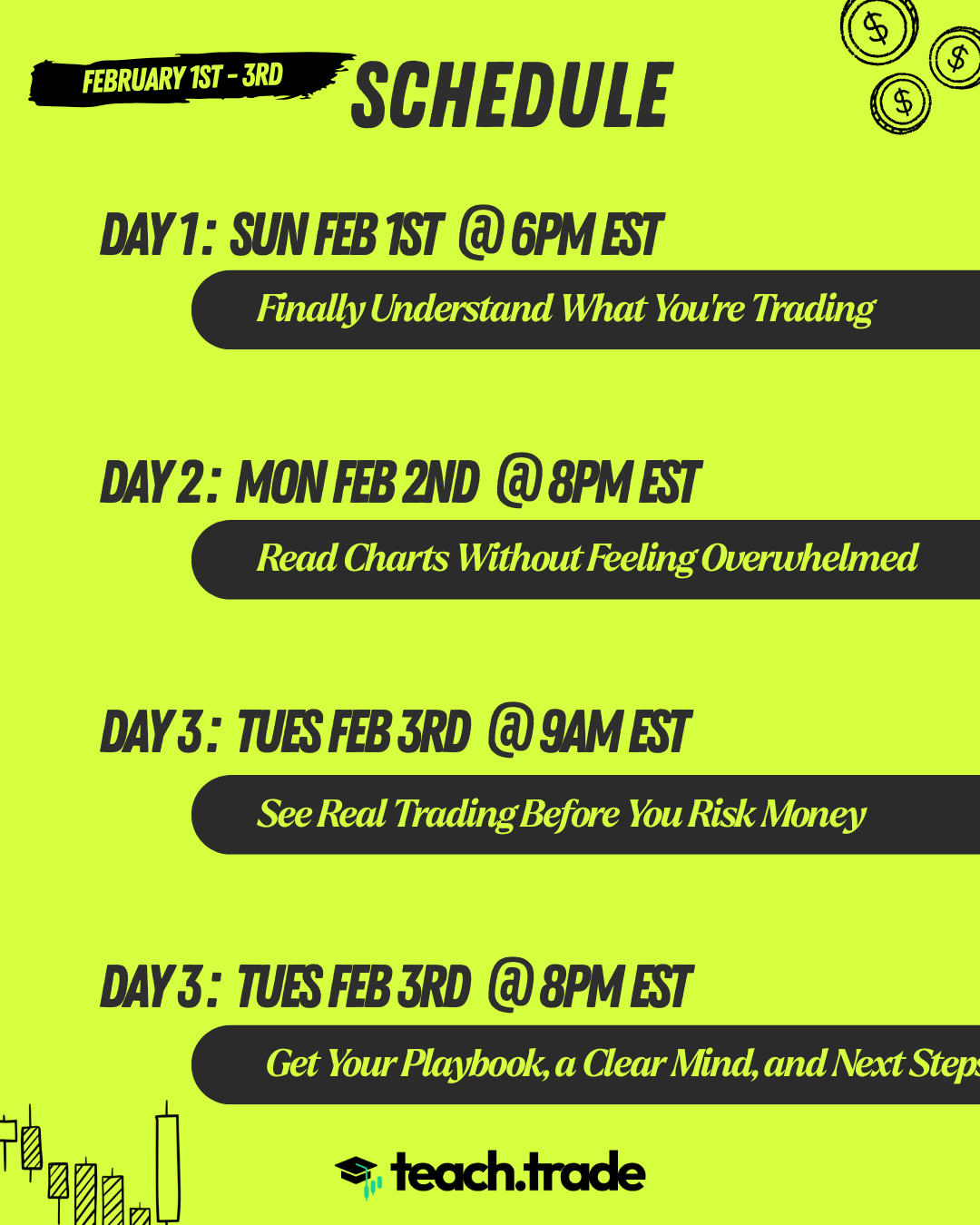 ✔ Live masterclasses that communicate important concepts ✔ Guided trading sessions to improve trading confidence and execution. ✔ Weekly Q&A + feedback sessions where no question goes unanswered ✔ Full access to exclusive strategy-building courses ✔ 7-Day Challenge competitions ✔ Community of profitable traders ✔ Interactive Quizzes to test your knowledge ✔ Journal with progress tracking ✔ Guided practice trading sessions ✔ High-probability strategy indicators